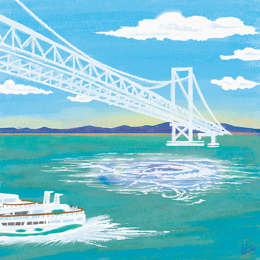 私はフェリーに乗り、目の前で渦潮を見ている。渦潮はまるで海を洗う大きな洗濯機のようにグルグルと渦巻いている。キラキラと光る日差しが海に反射して美しい。海の深い青緑色が実際よりも濃く、深く見えた。渦潮の中心を見ながら「のみこまれる~!!」思わず声が出た。