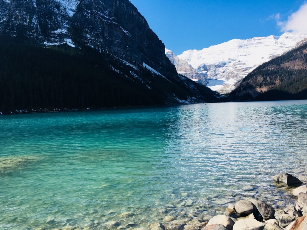 森の入口付近にある、頑丈そうな岩と丸太で作ったログハウス状の巨大ロッジが彼らの家で、その近くにはとても有名なホテルがあったぞ。レイクルイーズはいつも、どんな時でも、美しいエメラルドとサファイアの色が湖の中で混ざっていて、そこに山の強い日差しや、夏でも突然降って来る雪が降り注いでいて、動く絵画みたいだったな。